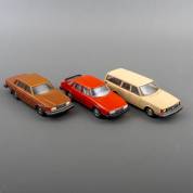 Drie kunststof modelauto's: Saab 900 turbo, Volvo 264 GL, Volvo 245 DL, uitvoering Stahlberg, Finland, jaren '80 -gebruikssporen- 6,5 × 23 × 7 cm
