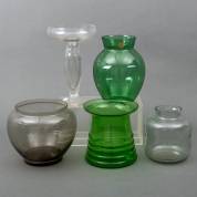 Twee blanke, een fumé, en twee groene glazen vazen, ontwerp o.a. Andries Dirk Copier, uitvoering Glasfabriek Leerdam, circa 1950, 23 cm