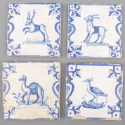 Vier Delfts aardewerk balustertegels met blauw-wit dierendecor: dromedaris, kievit, bok en hert, 17e eeuw -craquelé, enkele kleine hoek- en randbeschadigingen, kievit met opvullingen-, 13,5 x 13,5 cm