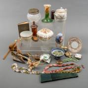 Chinese schoentjes voor gebonden voetjes, porseleinen theepotje en kop-en-schotel, bijouterieën, glazen kandelaar en glaasje, art nouveau, twee waaiers, agaat zoutschaaltje, houten parfumflesje met onedel montuur en glazen stopje, etc.