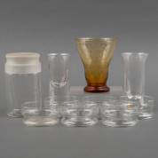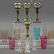 14 diverse glazen, waaronder gekleurde, en enkele glazen cocktailprikkers