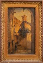 Zuid-Europese School: straatje met manddragende vrouw, olieverf op paneel, niet gesigneerd, begin 20e eeuw, 20 × 11,5 cm