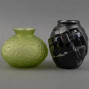 Groen glazen vaas met sterrendecor in reliëf, onderop gemerkt P.R. France, en auberginekleurige glazen vaas met geometrisch reliëfdecor, Frankrijk of België -miniem schilfertje aan binnenrand-, donkere vaas 19 cm hoog
