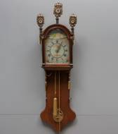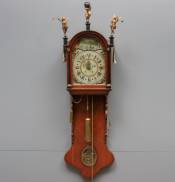Friese staartklok in eiken kast met drie gesneden houten poppen -enkele herstellingen-, de beschilderde wijzerplaat met figuren in een bootje en hoornen des overvloeds, circa 1800, inclusief gewicht en twee wekkergewichten -recentelijk gerestaureerd-, 148 cm