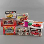 Zes kunststof en metalen modelauto's, en een modelmotor, diverse modellen en schalen, voornamelijk uitvoering Mattel Mebetoys, in originele verpakking, jaren '70 -enkele verpakkingen met schade-