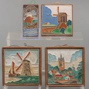 Vier aardewerk reliëftegels: twee molens, zeilschip en stadsgezicht, uitvoering De Porceleyne Fles, Delft, en Westraven, Utrecht, 11,5 × 11,5 cm