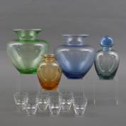 Amber en groen glazen karaf, blauwe stop, en zes blank glazen likeurglaasjes, model Rondo, ontwerp Andries Dirk Copier, uitvoering Glasfabriek Leerdam, 1935, gemerkt -aanslag, één glas met chipje-, daarbij: annagroene en blauw-grijze glazen vazen, één vals gemerkt voor Copier Leerdam