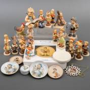 Verzameling porseleinen Hummels en bijbehorende bordjes, uitvoering Goebel, Duitsland -kleine defecten-, grootste Hummel 14 cm hoog