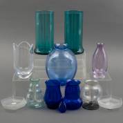 Vier blauw-, twee zeegroen-, roze-, annagroen-, twee blankglazen vazen, en paar gesatineerde blankglazen schaaltjes, uitvoering Glasfabriek, Leerdam, hoogte grote blauwe vaas 19 cm