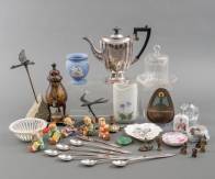 Verzilverde koffiepot, beschilderde blikken kraantjeskan, jasperware vaasje, Wedgwood, porseleinen draadjesmand, Herend, porseleinen schoteltje, Meissen, vijf porseleinen beeldjes, Goebel, zes Boeddhistische en Hindoeïstische bronzen talismannen, etc., theepot: 19 × 24 × 9,5 cm