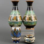 Vier stuks plateel: paar vazen, vaas met blauw vogeldecor en metalen lipje, uitgevoerd voor Liberty & Co -chipjes van standring-, en dekseldoosje, hoogte set vazen 31,5