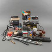 Diverse camera's en toebehoren, waaronder: Konica Z-UP 140 Super, Polaroid-camera, Kowa Kallo 35, en Minolta Autopak 450E