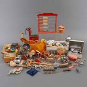 Divers oud speelgoed, waaronder: autootjes, popjes, en metalen kinderserviesje