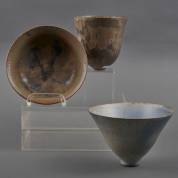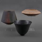 Heide van Veen-Kiehne (1946), schaal met brede rand, 20 × 22 cm, daarbij: Tjerk van der Veen (1955), conische keramische vaas met metaalzoutenglazuur, op onderzijde gemerkt en gedateerd '87, en zwarte vaas