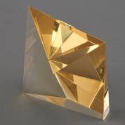 Okergeel gegoten glazen object met gladde geometrische vlakken, ontwerp en uitvoering André van Lier, niet gesigneerd, 13,5 × 14 × 5 cm