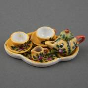 Miniatuur porseleinen theeserviesje voor poppenhuis, bloemdecor op geel fond, bestaande uit: theepotje, twee kop-en-schotels, melkkan en dienblaadje, uitvoering Desvres, Limoges, Frankrijk, 20e eeuw, dienblaadje: 6,2 × 3,9 cm