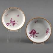 Porseleinen schoteltje en een aardewerk schoteltje, beide met purper bloemdecor en vergulde bies, beide niet gemerkt, 18e eeuw -het aardewerk exemplaar met randschilfers-, Ø 12,5 en 14 cm, herkomst: privécollectie van kunsthandelaar Abraham van der Meer (1927-2008), destijds gevestigd op de Spiegelgracht 3 te Amsterdam