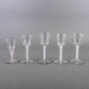Vijf verschillende slingerglazen met witte slingers, circa 1800 -de kleinste met een chipje van de voetrand-, 14 cm hoog