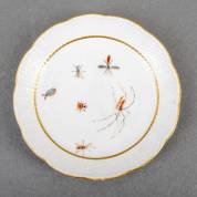 Porseleinen schoteltje met polychroom beschilderd insectendecor, de rand met vlechtwerk in reliëf, gemerkt, uitvoering Meissen, Duitsland -randchipje-, Ø 14 cm, herkomst: privécollectie van kunsthandelaar Abraham van der Meer (1927-2008), destijds gevestigd op de Spiegelgracht 3 te Amsterdam