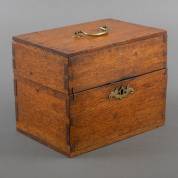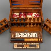 Eiken doos met diverse spellen, gemerkt 'Royal Cabinet of Games', waaronder schaken, backgammon en domino, Engeland, eind 19e eeuw -schaakstukken compleet maar met enkele defecten, twee zwarte backgammonstenen ontbreken, gebruikssporen-, 18 × 33 × 22 cm