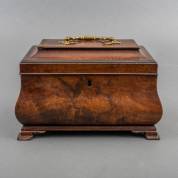 Mahonie theekist, voorzien van drie metalen theebussen met stergedecoreerde messing deksels, onderop gemerkt Josep, eind 18e/19e eeuw -scheur in deksel, droogtescheur in bodem, kleine defecten aan profieltje en pootjes-, 16 × 25 × 14,5 cm
