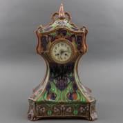 Grote plateel pendule met polychroom gestileerd lissendecor, uitvoering Faience- en Tegelfabriek Holland, Utrecht, circa 1901-1905, twee vergelijkbare pendules staan afgebeeld in Marianne Heslenfeld, 'De Collectie Holland, Art nouveau van de Faience- en Tegelfabriek Holland', uitg. Waanders, Zwolle, pag. 35 en 49 -kleine schilfer van rechterschouder-, hoogte 58 cm