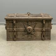 Gezwart metalen geldkist met smeedijzeren beslag en stervormige slotplaat, het roodgelakte interieur voorzien van vakje met sleutel, Duitsland, eind 17e eeuw -gebruikssporen-, 40 × 77 × 40 cm
