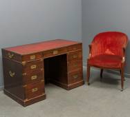 Mahonie bureau, zogenaamde 'campaign desk', met rood lederen blad, messing beslag, en staande op plintvoet, Engeland, circa 1900 -fineerschade, krassen-, 75 × 118 × 64 cm, en noten kuipstoeltje met rode velours bekleding, de taps toelopende poten op wieltjes -stof iets verkleurd-, 88 × 64 × 65 cm