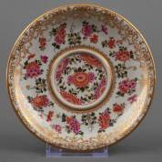 Porseleinen trembleuse-schoteltje met polychroom beschilderd bloemdecor en vergulde rand, gemerkt in bovenglazuur, uitvoering Meissen, Duitsland, vermoedelijk circa 1720-'30 -gerestaureerde randchip-, Ø 15 cm, herkomst: privécollectie van kunsthandelaar Abraham van der Meer (1927-2008), destijds gevestigd op de Spiegelgracht 3 te Amsterdam
