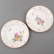 Paar porseleinen borden met polychroom beschilderd bloemdecor, de rand met vakverdeling en bladmotieven in reliëf, gemerkt, uitvoering Ludwigsburg, Duitsland, 18e eeuw -beide met een randchipje-, Ø 23 cm, herkomst: privécollectie van kunsthandelaar Abraham van der Meer (1927-2008), destijds gevestigd op de Spiegelgracht 3 te Amsterdam