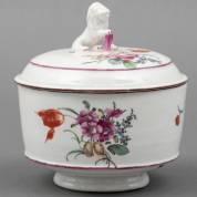 Bedekte porseleinen suikerpot met zittend leeuwtje op het deksel en polychroom beschilderd bloemdecor, gemerkt, uitvoering Ludwigsburg, Duitsland, 18e eeuw, met label Lucien Levy, Parijs -deksel met gerestaureerde chip aan binnenring en gerelateerde haarlijn-, 11,5 × Ø 10,5 cm, herkomst: privécollectie van kunsthandelaar Abraham van der Meer (1927-2008), destijds gevestigd op de Spiegelgracht 3 te Amsterdam