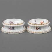 Paar porseleinen ovale zoutschaaltjes met polychroom beschilderd bloemdecor, de zijdes met vlechtwerk in reliëf, gemerkt, uitvoering Meissen, Duitsland, 18e eeuw -één met enkele schilfers van standring-, 3,5 × 10 × 7,5 cm, herkomst: privécollectie van kunsthandelaar Abraham van der Meer (1927-2008), destijds gevestigd op de Spiegelgracht 3 te Amsterdam