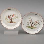 Paar porseleinen bordjes met polychroom beschilderd decor van vogels op tak, de rand met reliëf van vlechtwerk en beschilderde insecten, gemerkt, uitvoering Ludwigsburg, Duitsland, 18e eeuw, Ø 19 cm, herkomst: privécollectie van kunsthandelaar Abraham van der Meer (1927-2008), destijds gevestigd op de Spiegelgracht 3 te Amsterdam