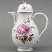 Haags porseleinen koffiekan met polychroom beschilderd bloemdecor, gemerkt, 18e eeuw -chipjes van knopje-, hoogte 21 cm, herkomst: privécollectie van kunsthandelaar Abraham van der Meer (1927-2008), destijds gevestigd op de Spiegelgracht 3 te Amsterdam