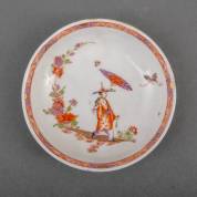 Porseleinen schoteltje met polychroom chinoiseriedecor: man met parasol loopt door bloementuin, in de stijl van Johann Ehrenfried Stadler, gemerkt, uitvoering Meissen, Duitsland, circa 1720-'30, Ø 12,2 cm, herkomst: privécollectie van kunsthandelaar Abraham van der Meer (1927-2008), destijds gevestigd op de Spiegelgracht 3 te Amsterdam