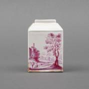 Porseleinen theebus met bietenrood landschapsdecor en gevlochten bovenrand, op de hoeken resten van vergulding, 18e eeuw -chipjes van bodem, deksel mist-, hoogte 10,5 cm