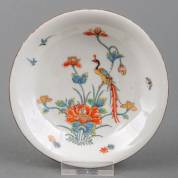 Böttger porseleinen schoteltje met Delfts polychroom beschilderd decor naar Kakiemon-voorbeeld: pauw op bloemtak, de onderzijde met bladmotieven in reliëf, niet gemerkt, vermoedelijk uitvoering Meissen, eerste kwart 18e eeuw -chips-, Ø 12,5 cm, herkomst: privécollectie van kunsthandelaar Abraham van der Meer (1927-2008), destijds gevestigd op de Spiegelgracht 3 te Amsterdam