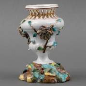 Aardewerk vaas met opengewerkte hals, geappliqueerde rozentakjes en staande op voet in de vorm van grond met bladeren, gemerkt, mogelijk uitvoering Honoré Savy, Frankrijk, 18e eeuw -defecten-, hoogte 16 cm, herkomst: privécollectie van kunsthandelaar Abraham van der Meer (1927-2008), destijds gevestigd op de Spiegelgracht 3 te Amsterdam