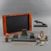Tinnen inktstel, bronzen beeld: springende jaguar, verguld collier en armband, vulpen 'Champion', goudsteen en tijgeroog Boeddha hoofden, klein reisklokje in messing kast -defect-, Romeins marmeren hoofd, etc., op presenteerblad van Franck Muller Geneve, inktstel: 32 × 11,5 cm