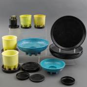 Zes diverse graniver cactuspotjes en -schalen, daarbij: dertien zwarte persglazen onderzetters en een zwart persglazen cactuspotje, alle ontwerp A.D. Copier, uitvoering Glasfabriek Leerdam -gebruikssporen- grootste schaal Ø 22 cm