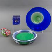 Vier glasobjecten van diverse kunstenaars en uitvoeringen, waaronder Leerdam en Kosta Boda -krasjes-, schaal Ø 30 cm