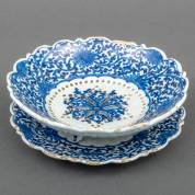 Delfts aardewerk fruittest op onderschotel, het geheel met rijk bloemdecor, uitvoering De Porceleyne Bijl, 18e eeuw -fruittest met twee oude randrestauraties-, 7,5 × Ø 22,5 cm