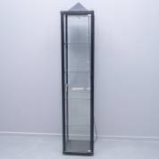 Glazen vitrine met zwart metalen frame, in de piramidale kap een halogeenspot, 200 × 41 × 41 cm