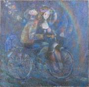 Vyacheslav Shraga (1953), 'Achter de regenboog', olieverf op doek, r.o. en op achterzijde gesigneerd -doek vervuild, spieraam getordeerd-, 102 × 98 cm
