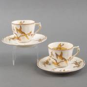Twee wit porseleinen kop-en-schotels met goudkleurige reigerdecor, uitvoering L. Bernardaud & Co, Limoges, 1957, ter viering van het staatsbezoek van Elizabeth II aan Frankrijk -standring van een kopje met chip-, één kop-en-schotel 6,5 × Ø 13,5 cm