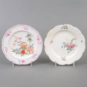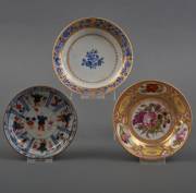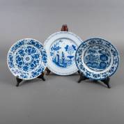 Drie verschillende porseleinen schoteltjes met polychroom bloemen- en figurendecors, 18e en 19e eeuw -twee met een haarlijn-, grootste Ø 14,5 cm, herkomst: privécollectie van kunsthandelaar Abraham van der Meer (1927-2008), destijds gevestigd op de Spiegelgracht 3 te Amsterdam
