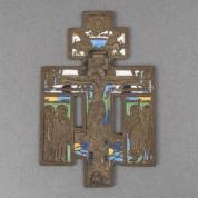 Deels polychroom geëmailleerde bronzen Russisch-orthodoxe reisicoon: Christus aan het kruis, 16,5 × 11 cm