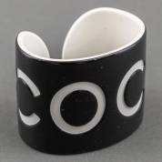 Zwarte kunststof armband met witte verdiepte letters 'COCO', binnenmaat rondom circa 15 centimeter, maat XS, aan binnenzijde gemerkt, uitvoering Coco Chanel, Parijs, 21e eeuw -lichte gebruikssporen-