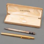 1e gehalte zilveren ballpoint met lijnendecor, Sheaffer, en 18kt goud vergulde vulpen, Cap & Barrel, Ierland