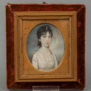 Miniatuurportret van vrouw in witte jurk, gouache, in verguld messing lijst, 19e eeuw, 7,5 × 6 cm